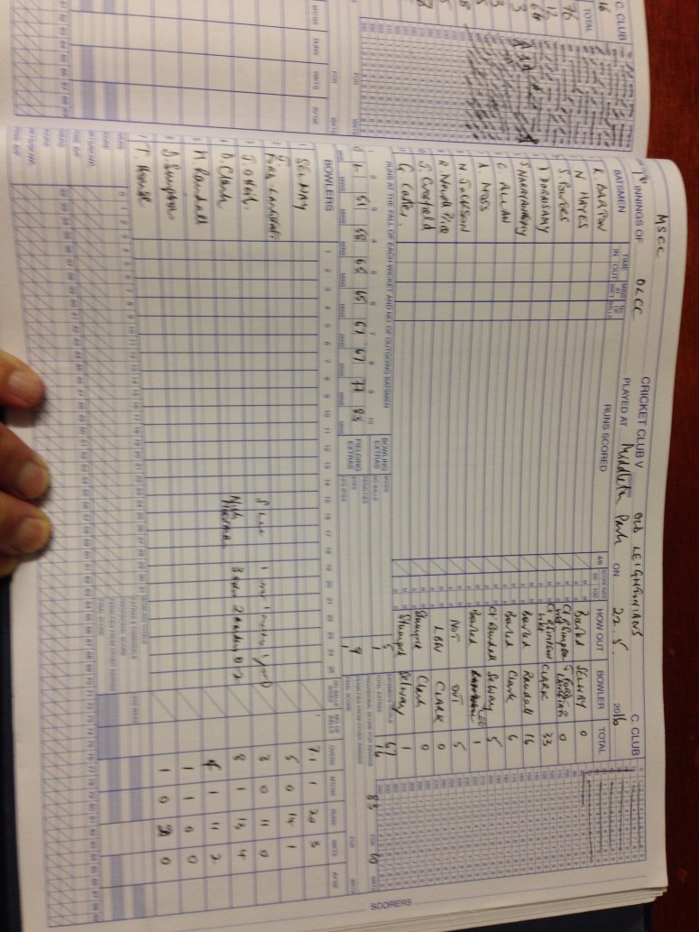 I then deployed ten bowlers cunningly so that Old Leightonians were all out for 83, with 4 of the last 20 overs remaining. Most importantly, our scorebook shows these two lines: